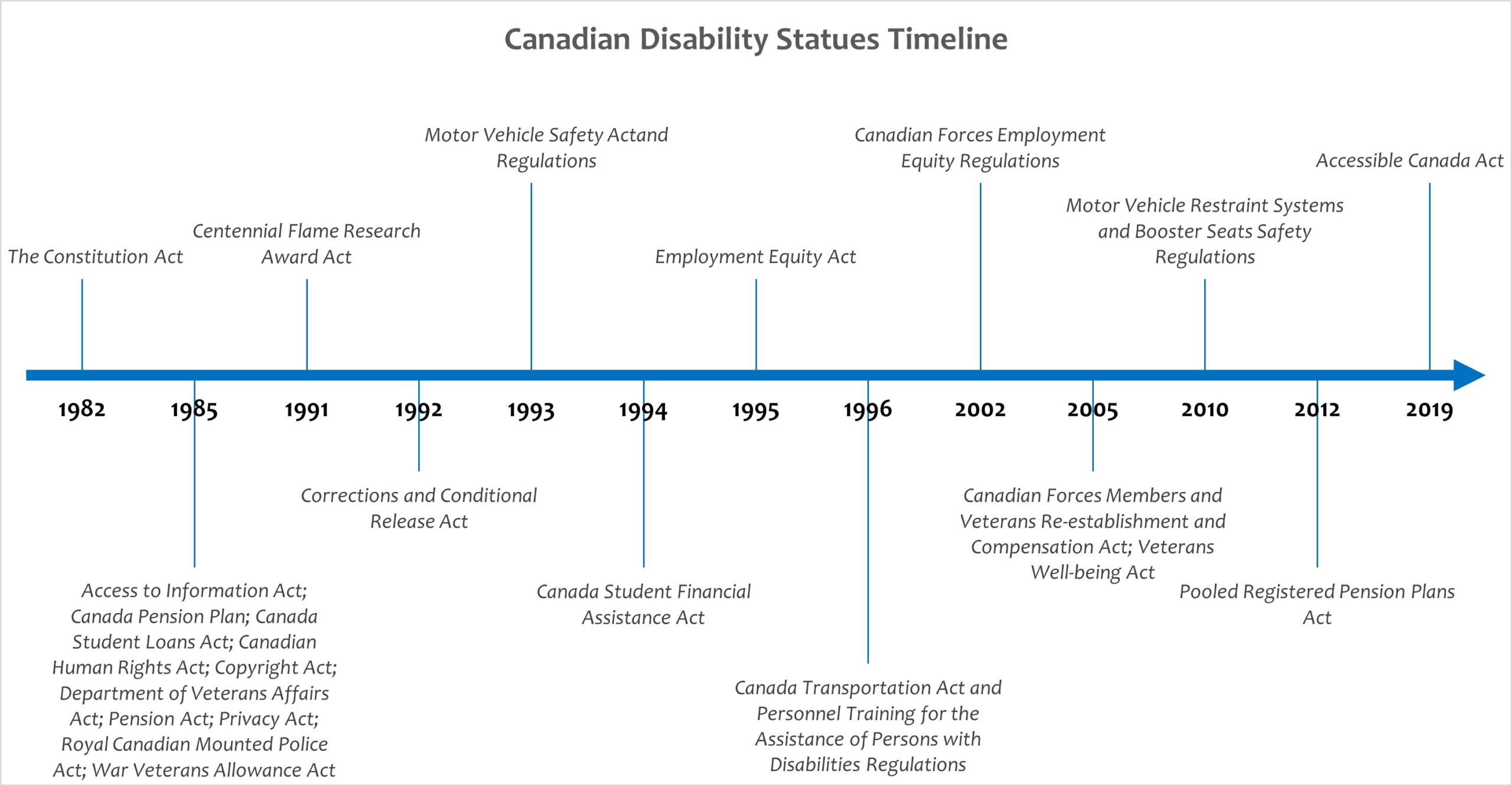 Since 1975, there have been many policy events that have aimed towards a more inclusive Canada. The timeline below displays the federal disability policy events that have occurred in the last 4 decades.